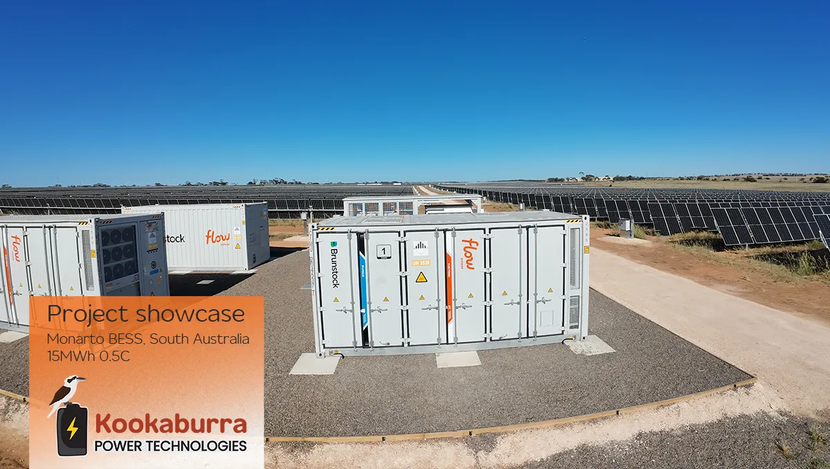Kookaburra Power Technologies is supplying a 15MWh battery energy storage system for Flow Power’s Monarto Energy Project. This includes three 5MWh battery energy storage containers (with 4.6MW inverter output) and a step-up transformer station, all of which are made by Brunstock.